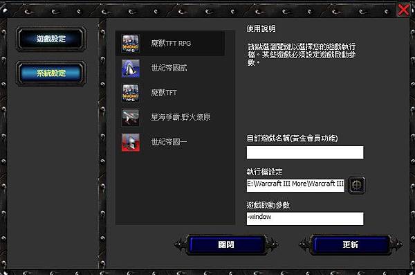 點擊遊戲設定按鈕,在遊戲起動參數輸入-window,然後點選更新。